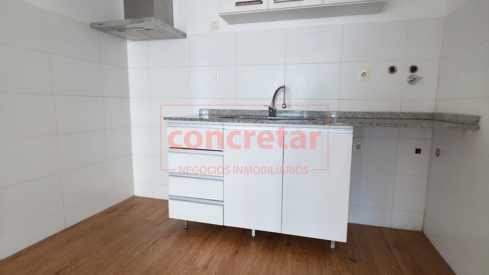 Cocina con placares aéreo y bajo mesada, conexión para lavarropas y campana empotrada.
